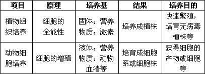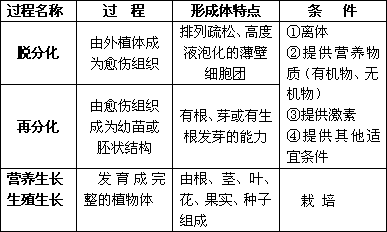 植物组织培养可快速繁殖,培育无病毒植株,还可以通过大规模的植物细胞培养来生产药物、食品添加剂、香料、色素和杀虫剂,另外,还可将植物组织培养形成的胚状体,包裹上人工种皮,制成人工种子。有关植物组织培养的内容见下表: