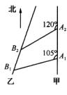 20、(本小题满分13分)如图所示,甲船以每小时 海里的速度向正北方航行,乙船按固定方向匀速直线航行,当甲船位于A1处时,乙船位于甲船的北偏西105°方向的B1处,此时两船相距20海里,当甲船航行20min到达A2处时,乙船航行到甲船的北偏西120°方向的B2处,此时两船相距 海里,问乙船每小时航行多少海里?
