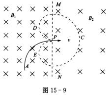 35、K-介子衰变的方程为K-→π-+π+,其中K-介子和π-介子带负的元电荷e,π0介子不带电.如图所示两匀强磁场方向相同,以虚线MN为理想边界,磁感应强度分别为B1、B2.今有一个K-介子沿垂直于磁场的方向射入匀强磁场B1中,其轨迹为圆弧AP,P在MN上,K-介子在P点时的速度为v,方向与MN垂直.在P点该介子发生了上述衰变后产生的,π-介子沿v的反方向以大小为v的速度射出,其运动轨迹为图15-9中虚线所示的“心”形图线,则以下说法正确的的是( )