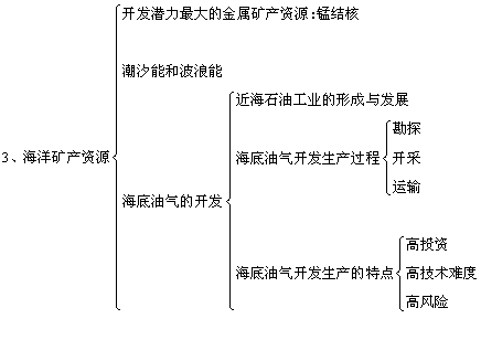 3、海洋矿产资源与油气开发 (1)海底矿产资源的类型和分布,如图: