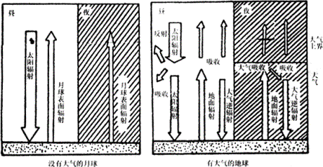 答案: 因为月球没有大气,白天,在太阳辐射下,月面温度升得很高;夜间,月球表面辐射剧烈,月面温度骤降,所以温度变化剧烈。地球上因为有大气存在,由于大气的热力作用,在白天,大气的反射、散射和吸收削弱了到达地面的太阳辐射,使白天地面的气温不致过高;夜间,地面辐射绝大部分热量又被大气逆辐射还给了地面,使夜间地面气温不致降得过低,从而减小了气温日较差。