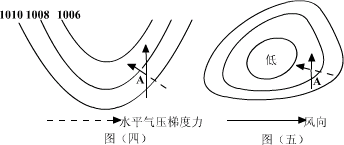 上述方法同样适用于等压线为曲线或闭合曲线的图中。例如:北半球地面等压线图(四)、图(五)中A点的风向。