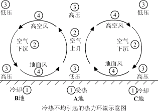 这部分内容若读图不当,易得出“水平方向空气由高压流向低压,而垂直方向空气由低压流向高压”的错误结论。解决这一问题的关键在于把握住“冷热不均”这一热力环流的根本成因。如下图(《冷热不均引起的热力环流示意图》)所示,在课文中有关热力环流成因的总结文字中标注①②③④,相邻的前后两点为因果关系。即①→②→③→④,并把4个符号标注在图中相应位置上。按照以下程序分析理解,则不易混淆。课文:①近地面空气的受热或冷却。②引起气流的上升或下沉运动。③空气的上升或下沉,导致同一水平面上气压的差异。④气压差异又形成大气的水平运动。