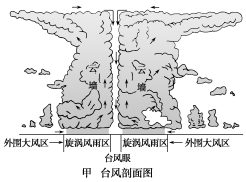 由图甲可知,台风由外围大风区、漩涡风雨区和台风眼三部分组成。