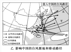 由图乙可知,西北太平洋是台风发生频率最高的区域,台风灾害主要分布在我国东海地区,多发于夏秋季节。