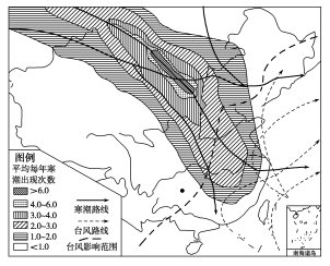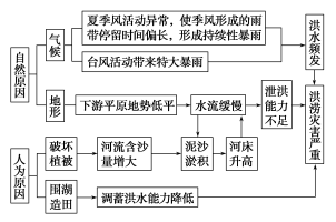答案:地处平原,地势低平,受南部山区洪水和河流上游汇水的共同影响;排洪通道少,且易受到潮水和其他河流洪水的顶托,排水不畅;处于台风过境或登陆区,台风常带来强降雨。