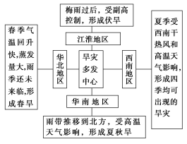 解析:我国西南地区是湿润地区,一年四季都可能发生旱灾,而“十年九旱”出现在半干旱区;盛夏季节,东北地区常有久晴高温天气,引起“三天一小干,五天一大旱”的旱灾;长江地区7~8月份在副高影响下形成“伏旱”,影响农作物生长和城市供水,有“春旱不算旱,夏旱减一半”的说法;华北地区春季升温快,蒸发旺盛,此时正值冬小麦生长发育关键期,故有“春雨贵如油”的说法。