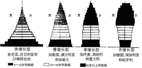人口学家还常常按人类生命史不同阶段分组,一般分为未成年(0~14岁)、青壮年(15~64岁)和老年(65岁以上)三组,按人口年龄结构,一般又分为增长型(快增长和慢增长型)、静止型(零增长型)和缩减型(负增长型)等几种。下图为四种人口金字塔的模型,予以了解。
