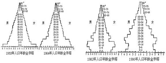 下图是我国1953年、1964年、1982年和1990年的人口年龄金字塔:
