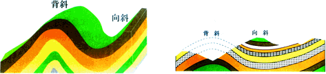 ②背斜顶部因受张力、岩层容易被侵蚀,反而成谷地。 |