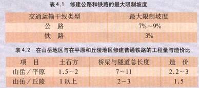 从表中分析,铁路的最大限制坡度远远小于公路,说明其对地形的要求较高。山岳地区工程量和造价均比平原、丘陵地区高。综合分析来看,在山区修铁路比较困难,而发展公路相对容易些。