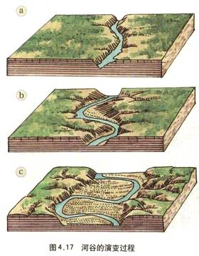 河流在凹岸侵蚀,在凸岸堆积,河谷出现连续的河湾。 |