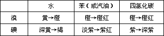 (3)上表所列颜色变化情况比较复杂,常说的颜色为:溴水为黄色,溴溶解在有机溶剂中为橙红色,碘水为黄色,碘溶解在苯、汽油、四氯化碳中为紫色,碘溶解在酒精中(即碘酒)为褐色。