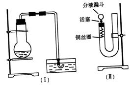 13、实验室用稀硝酸与Cu反应来制备NO气体,如果采用图(Ⅰ)装置,由于烧瓶内的空气不易排出,生成的NO很快被氧化成红棕色的NO2,不易观察到有无色的NO生成。即使可用排水法收集到无色的NO,也无说服力,学生会认为NO是由NO2与H2O反应生成的。有人设计了图(Ⅱ)装置,用来做该实验可以达到满意的效果。
