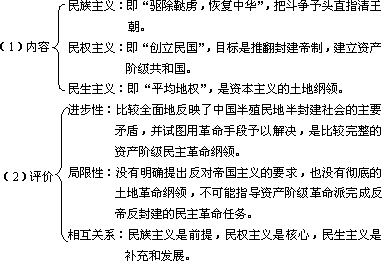 (2)同盟会有明确而且较完整的政治纲领——“驱除鞑虏,恢复中华,创立民国,平均地权”。后来,孙中山又将其阐发为“民族”、“民权”、“民生”三大主义,简称三民主义。