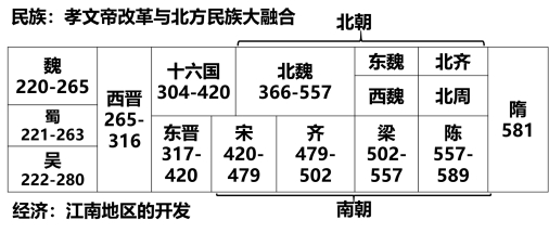 2.南方政权更迭:420年,东晋武将刘裕称帝,国号宋。此后,南方经历了宋、齐、梁、陈四个朝代,合称“南朝”