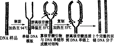 (2)当温度降低时,引物与模板末端结合,在DNA聚合酶的作用下,引物沿模板链延伸,最终合成2条DNA分子,此过程的原料是______________,遵循的原则是_______。