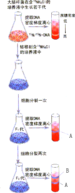 14、在氮源为15N的培养基上生长的大肠杆菌,其DNA分子均为15N—DNA(对照);在氮源为14N的培养基上生长的大肠杆菌其DNA分子均为14N—DNA(亲代)。将亲代大肠杆菌转移到含14N的培养基上,再连续繁殖两代(F1和F2),用某种离心方法分离得到的结果如图所示。请分析: