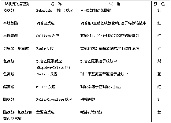 对各种氨基酸特异的某些颜色反应(见表),可用来检测含有这些氨基酸的蛋白质。这些颜色反应包括Millon反应、黄蛋白反应、茚三酮反应以及Hopkins-Cole(水合乙醛酸)反应等。