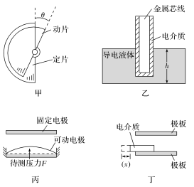 解析 甲图是通过改变动片和静片的正对面积来实现电容改变的,改变正对面积的方式是通过转动,因此可以作为角度传感器;乙图传感器是通过导电液体液面升、降改变与金属芯线的正对面积,从而改变电容,所以可用来测量液体深度;丙图传感器可根据压力的不同使膜片与固定极板的距离不同,实现了力与电容的转换;丁图是通过改变介质的位置而改变电容的,属位置传感器,不能用来测速度。选项A.B.C正确,D错误。