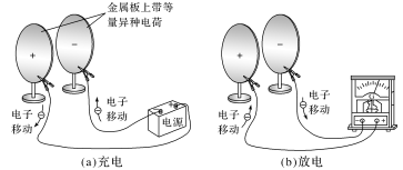 (1)充电:把电容器的两极板分别与电池组的两极相连,两极板上分别带上等量的异号电荷的过程。