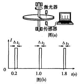 例7、一水平放置的圆盘绕竖直固定轴转动,在圆盘上沿半径开有一条宽度为2mm的均匀狭缝.将激光器与传感器上下对准,使二者间连线与转轴平行,分别置于圆盘的上下两侧,且可以同步地沿圆盘半径方向匀速移动,激光器连续向下发射激光束.在圆盘转动过程中,当狭缝经过激光器与传感器之间时,传感器接收到一个激光信号,并将其输入计算机,经处理后画出相应图线.图(a)为该装置示意图,图(b)为所接收的光信号随时间变化的图线,横坐标表示时间,纵坐标表示接收到的激光信号强度,图中Δt1=1.0×10-3s,Δt2=0.8×10-3s.