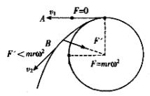 ③当提供向心力的合外力不完全消失,而只是小于应当具有的向心力,F′<mrω2,即合外力不足提供所需的向心力的情况下,物体沿切线与圆周之间的一条曲线运动,如图中B示.