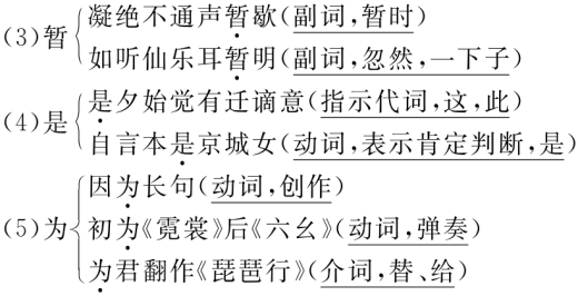 答案 ①酝酿准备阶段:“转轴拨弦三两声,未成曲调先有情”仅是调弦校音,就显示了琵琶女的演奏才能和丰富的感情。②起始阶段:这个阶段,乐声渐起,“低眉信手续续弹”“轻拢慢捻抹复挑”。这便将弹奏时的神态与自如的动作、灵活多变的指法,惟妙惟肖地呈现于读者面前。③起伏跌宕阶段:由“大弦嘈嘈”“小弦切切”写到“莺语花底”“泉流冰下”,再到“无声胜有声”,最后又“银瓶乍破”“铁骑突出”。④收尾阶段:戛然而止,干净利落。