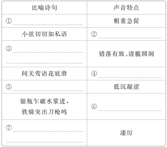 答案 ①大弦嘈嘈如急雨 ②轻柔尖细(委婉缠绵) ③嘈嘈切切错杂弹,大珠小珠落玉盘 ④悠扬婉转 ⑤幽咽泉流冰下难 ⑥激越雄壮、高亢激昂 ⑦曲终收拨当心画,四弦一声如裂帛